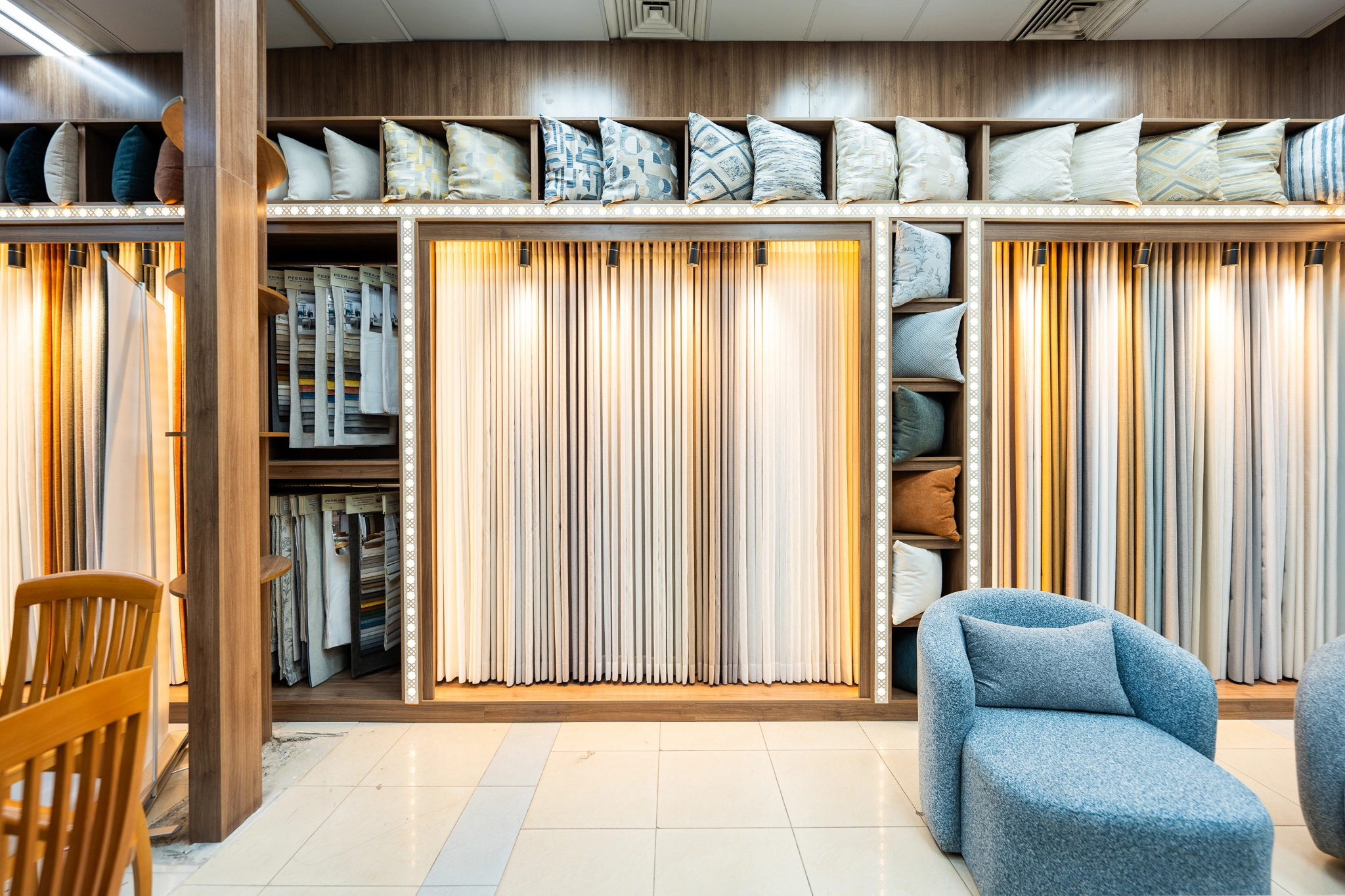 حلول مصممة خصيصًا لتنسجم مع روح المكـــان، بأقمشــــة فاخرة وخيـــارات متنوعـــة من التصاميم الكلاسيكية والعصرية، مع اهتمام بالتفاصيل يضفي لمسة ساحرة على كل مساحة.